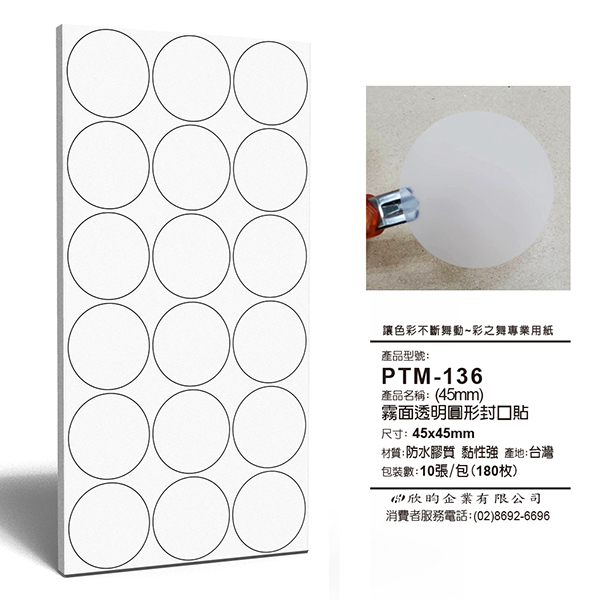 PTM-136霧面透明圓形封口貼(45mm) 180枚/包(空白無印刷)規格